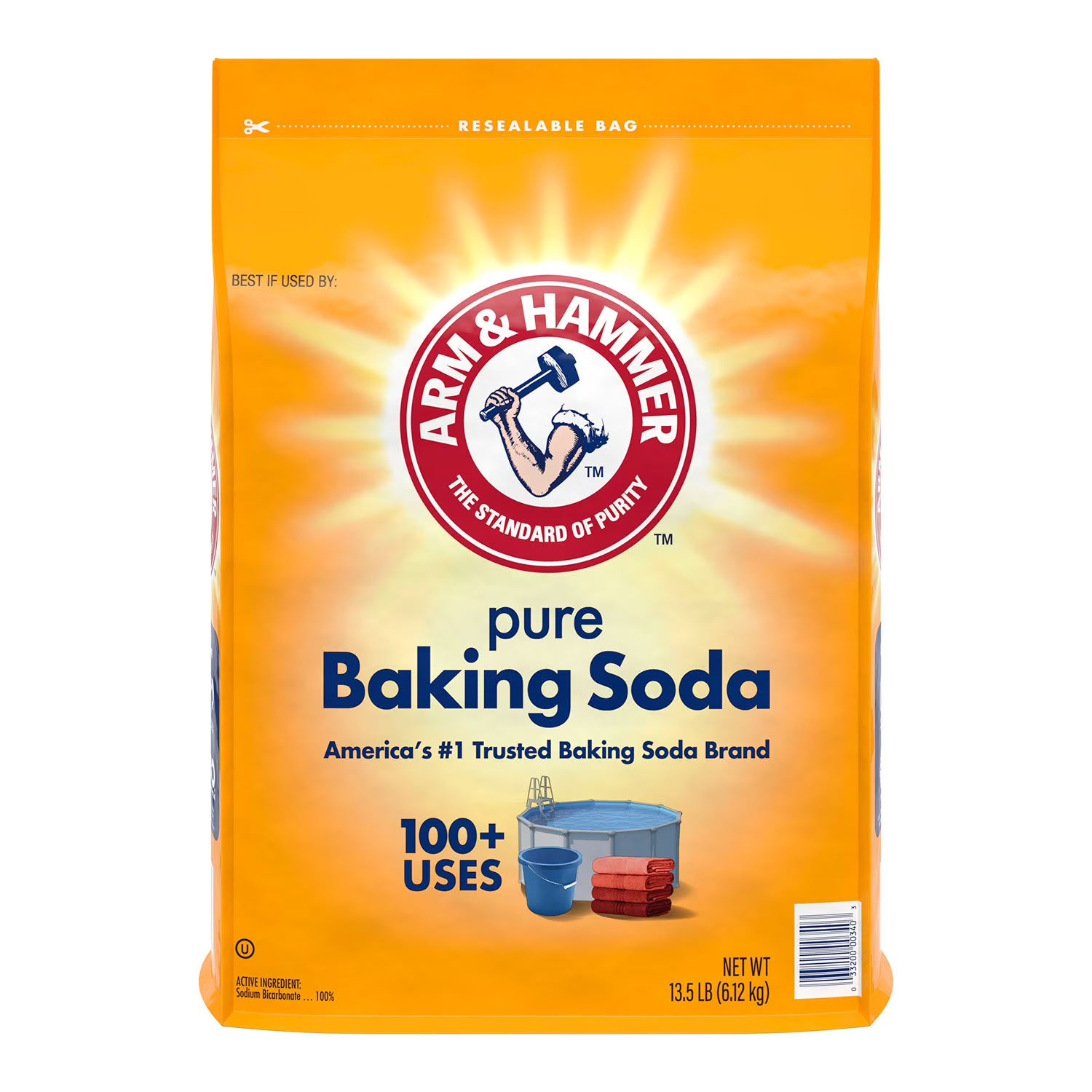 Arm & Hammer Pure Baking Soda is a 100% pure, high-quality baking soda, trusted worldwide for its exceptional versatility. This large 13.5 lb size is perfect for homes, bakeries, restaurants, businesses, and deep cleaning tasks.